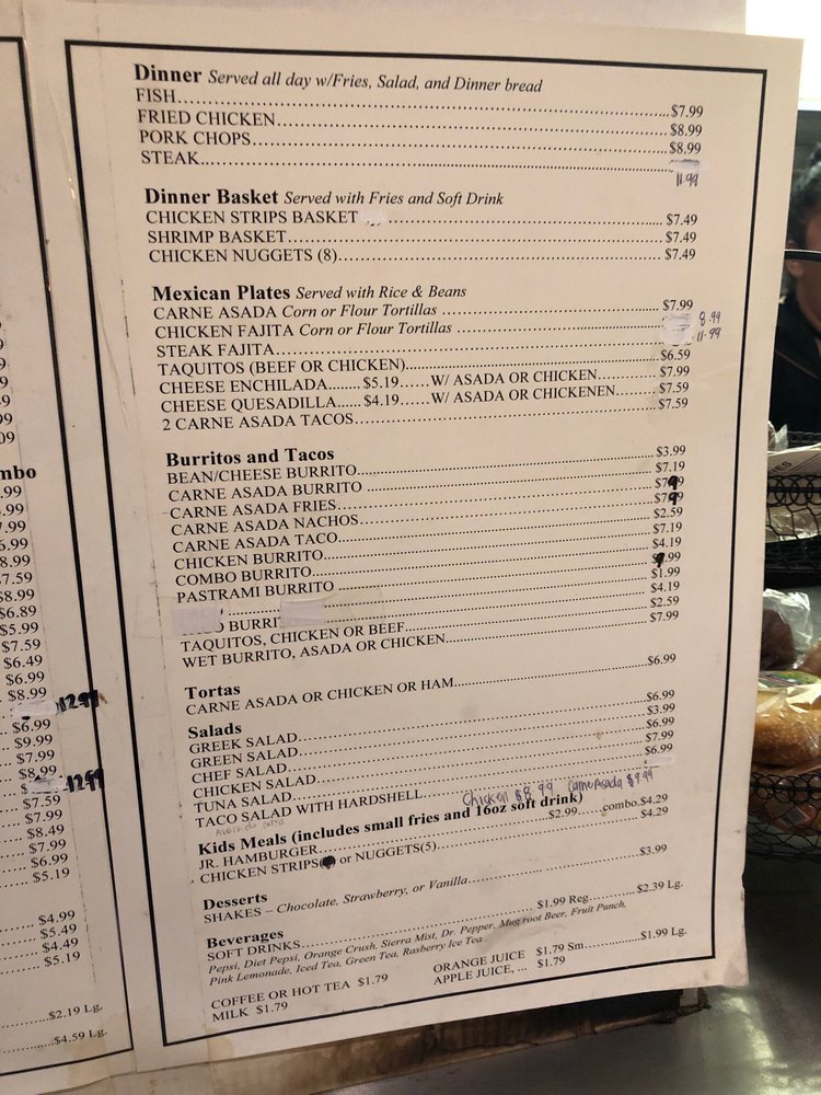 Soda options include brewed ice tea, diet and regular Pepsi, Dr. Pepper, fruit punch, green and raspberry ice tea, horchata, Jamaica, Mug root beer, pink lemonade, Sierra Mist, sweet tea. Regular or large.